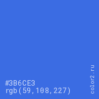 Цвет #3B6CE3 в цветовой модели RGB обозначается тремя октетами (59, 108, 227) в десятичном формате и #3B6CE3 в шестнадцатиричном (hex) формате, которые являются интенсивностью красного 59 (hex 3B), интенсивность зелёного 108 (hex 6C) и интенсивность синего 227 (hex E3).