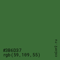 Цвет #3B6D37 в цветовой модели RGB обозначается тремя октетами (59, 109, 55) в десятичном формате и #3B6D37 в шестнадцатиричном (hex) формате, которые являются интенсивностью красного 59 (hex 3B), интенсивность зелёного 109 (hex 6D) и интенсивность синего 55 (hex 37).