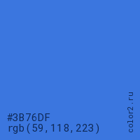 Цвет #3B76DF в цветовой модели RGB обозначается тремя октетами (59, 118, 223) в десятичном формате и #3B76DF в шестнадцатиричном (hex) формате, которые являются интенсивностью красного 59 (hex 3B), интенсивность зелёного 118 (hex 76) и интенсивность синего 223 (hex DF).