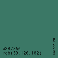 Цвет #3B7866 в цветовой модели RGB обозначается тремя октетами (59, 120, 102) в десятичном формате и #3B7866 в шестнадцатиричном (hex) формате, которые являются интенсивностью красного 59 (hex 3B), интенсивность зелёного 120 (hex 78) и интенсивность синего 102 (hex 66).