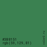 Цвет #3B8151 в цветовой модели RGB обозначается тремя октетами (59, 129, 81) в десятичном формате и #3B8151 в шестнадцатиричном (hex) формате, которые являются интенсивностью красного 59 (hex 3B), интенсивность зелёного 129 (hex 81) и интенсивность синего 81 (hex 51).