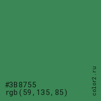 Цвет #3B8755 в цветовой модели RGB обозначается тремя октетами (59, 135, 85) в десятичном формате и #3B8755 в шестнадцатиричном (hex) формате, которые являются интенсивностью красного 59 (hex 3B), интенсивность зелёного 135 (hex 87) и интенсивность синего 85 (hex 55).