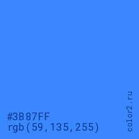 Цвет #3B87FF в цветовой модели RGB обозначается тремя октетами (59, 135, 255) в десятичном формате и #3B87FF в шестнадцатиричном (hex) формате, которые являются интенсивностью красного 59 (hex 3B), интенсивность зелёного 135 (hex 87) и интенсивность синего 255 (hex FF).