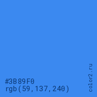 Цвет #3B89F0 в цветовой модели RGB обозначается тремя октетами (59, 137, 240) в десятичном формате и #3B89F0 в шестнадцатиричном (hex) формате, которые являются интенсивностью красного 59 (hex 3B), интенсивность зелёного 137 (hex 89) и интенсивность синего 240 (hex F0).