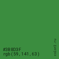 Цвет #3B8D3F в цветовой модели RGB обозначается тремя октетами (59, 141, 63) в десятичном формате и #3B8D3F в шестнадцатиричном (hex) формате, которые являются интенсивностью красного 59 (hex 3B), интенсивность зелёного 141 (hex 8D) и интенсивность синего 63 (hex 3F).