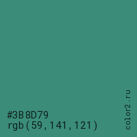 Цвет #3B8D79 в цветовой модели RGB обозначается тремя октетами (59, 141, 121) в десятичном формате и #3B8D79 в шестнадцатиричном (hex) формате, которые являются интенсивностью красного 59 (hex 3B), интенсивность зелёного 141 (hex 8D) и интенсивность синего 121 (hex 79).