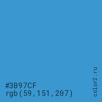 Цвет #3B97CF в цветовой модели RGB обозначается тремя октетами (59, 151, 207) в десятичном формате и #3B97CF в шестнадцатиричном (hex) формате, которые являются интенсивностью красного 59 (hex 3B), интенсивность зелёного 151 (hex 97) и интенсивность синего 207 (hex CF).