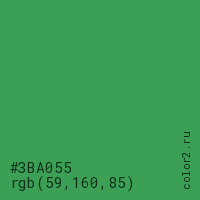 Цвет #3BA055 в цветовой модели RGB обозначается тремя октетами (59, 160, 85) в десятичном формате и #3BA055 в шестнадцатиричном (hex) формате, которые являются интенсивностью красного 59 (hex 3B), интенсивность зелёного 160 (hex A0) и интенсивность синего 85 (hex 55).