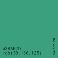 Цвет #3BA07D в цветовой модели RGB обозначается тремя октетами (59, 160, 125) в десятичном формате и #3BA07D в шестнадцатиричном (hex) формате, которые являются интенсивностью красного 59 (hex 3B), интенсивность зелёного 160 (hex A0) и интенсивность синего 125 (hex 7D).