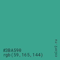 Цвет #3BA590 в цветовой модели RGB обозначается тремя октетами (59, 165, 144) в десятичном формате и #3BA590 в шестнадцатиричном (hex) формате, которые являются интенсивностью красного 59 (hex 3B), интенсивность зелёного 165 (hex A5) и интенсивность синего 144 (hex 90).