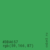 Цвет #3BA657 в цветовой модели RGB обозначается тремя октетами (59, 166, 87) в десятичном формате и #3BA657 в шестнадцатиричном (hex) формате, которые являются интенсивностью красного 59 (hex 3B), интенсивность зелёного 166 (hex A6) и интенсивность синего 87 (hex 57).
