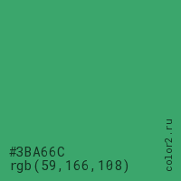 Цвет #3BA66C в цветовой модели RGB обозначается тремя октетами (59, 166, 108) в десятичном формате и #3BA66C в шестнадцатиричном (hex) формате, которые являются интенсивностью красного 59 (hex 3B), интенсивность зелёного 166 (hex A6) и интенсивность синего 108 (hex 6C).
