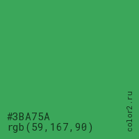 Цвет #3BA75A в цветовой модели RGB обозначается тремя октетами (59, 167, 90) в десятичном формате и #3BA75A в шестнадцатиричном (hex) формате, которые являются интенсивностью красного 59 (hex 3B), интенсивность зелёного 167 (hex A7) и интенсивность синего 90 (hex 5A).