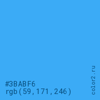 Цвет #3BABF6 в цветовой модели RGB обозначается тремя октетами (59, 171, 246) в десятичном формате и #3BABF6 в шестнадцатиричном (hex) формате, которые являются интенсивностью красного 59 (hex 3B), интенсивность зелёного 171 (hex AB) и интенсивность синего 246 (hex F6).