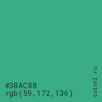 Цвет #3BAC88 в цветовой модели RGB обозначается тремя октетами (59, 172, 136) в десятичном формате и #3BAC88 в шестнадцатиричном (hex) формате, которые являются интенсивностью красного 59 (hex 3B), интенсивность зелёного 172 (hex AC) и интенсивность синего 136 (hex 88).