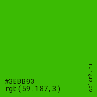 Цвет #3BBB03 в цветовой модели RGB обозначается тремя октетами (59, 187, 3) в десятичном формате и #3BBB03 в шестнадцатиричном (hex) формате, которые являются интенсивностью красного 59 (hex 3B), интенсивность зелёного 187 (hex BB) и интенсивность синего 3 (hex 03).
