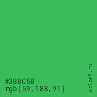 Цвет #3BBC5B в цветовой модели RGB обозначается тремя октетами (59, 188, 91) в десятичном формате и #3BBC5B в шестнадцатиричном (hex) формате, которые являются интенсивностью красного 59 (hex 3B), интенсивность зелёного 188 (hex BC) и интенсивность синего 91 (hex 5B).