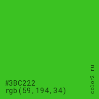 Цвет #3BC222 в цветовой модели RGB обозначается тремя октетами (59, 194, 34) в десятичном формате и #3BC222 в шестнадцатиричном (hex) формате, которые являются интенсивностью красного 59 (hex 3B), интенсивность зелёного 194 (hex C2) и интенсивность синего 34 (hex 22).