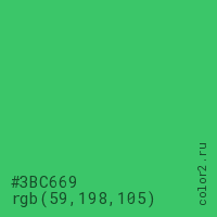 Цвет #3BC669 в цветовой модели RGB обозначается тремя октетами (59, 198, 105) в десятичном формате и #3BC669 в шестнадцатиричном (hex) формате, которые являются интенсивностью красного 59 (hex 3B), интенсивность зелёного 198 (hex C6) и интенсивность синего 105 (hex 69).