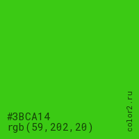 Цвет #3BCA14 в цветовой модели RGB обозначается тремя октетами (59, 202, 20) в десятичном формате и #3BCA14 в шестнадцатиричном (hex) формате, которые являются интенсивностью красного 59 (hex 3B), интенсивность зелёного 202 (hex CA) и интенсивность синего 20 (hex 14).