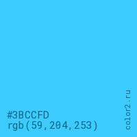 Цвет #3BCCFD в цветовой модели RGB обозначается тремя октетами (59, 204, 253) в десятичном формате и #3BCCFD в шестнадцатиричном (hex) формате, которые являются интенсивностью красного 59 (hex 3B), интенсивность зелёного 204 (hex CC) и интенсивность синего 253 (hex FD).