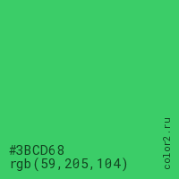 Цвет #3BCD68 в цветовой модели RGB обозначается тремя октетами (59, 205, 104) в десятичном формате и #3BCD68 в шестнадцатиричном (hex) формате, которые являются интенсивностью красного 59 (hex 3B), интенсивность зелёного 205 (hex CD) и интенсивность синего 104 (hex 68).