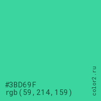 Цвет #3BD69F в цветовой модели RGB обозначается тремя октетами (59, 214, 159) в десятичном формате и #3BD69F в шестнадцатиричном (hex) формате, которые являются интенсивностью красного 59 (hex 3B), интенсивность зелёного 214 (hex D6) и интенсивность синего 159 (hex 9F).