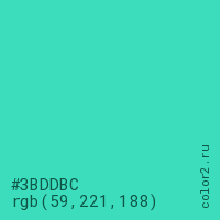 Цвет #3BDDBC в цветовой модели RGB обозначается тремя октетами (59, 221, 188) в десятичном формате и #3BDDBC в шестнадцатиричном (hex) формате, которые являются интенсивностью красного 59 (hex 3B), интенсивность зелёного 221 (hex DD) и интенсивность синего 188 (hex BC).