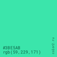Цвет #3BE5AB в цветовой модели RGB обозначается тремя октетами (59, 229, 171) в десятичном формате и #3BE5AB в шестнадцатиричном (hex) формате, которые являются интенсивностью красного 59 (hex 3B), интенсивность зелёного 229 (hex E5) и интенсивность синего 171 (hex AB).