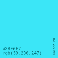 Цвет #3BE6F7 в цветовой модели RGB обозначается тремя октетами (59, 230, 247) в десятичном формате и #3BE6F7 в шестнадцатиричном (hex) формате, которые являются интенсивностью красного 59 (hex 3B), интенсивность зелёного 230 (hex E6) и интенсивность синего 247 (hex F7).
