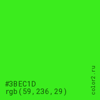 Цвет #3BEC1D в цветовой модели RGB обозначается тремя октетами (59, 236, 29) в десятичном формате и #3BEC1D в шестнадцатиричном (hex) формате, которые являются интенсивностью красного 59 (hex 3B), интенсивность зелёного 236 (hex EC) и интенсивность синего 29 (hex 1D).