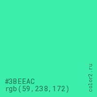 Цвет #3BEEAC в цветовой модели RGB обозначается тремя октетами (59, 238, 172) в десятичном формате и #3BEEAC в шестнадцатиричном (hex) формате, которые являются интенсивностью красного 59 (hex 3B), интенсивность зелёного 238 (hex EE) и интенсивность синего 172 (hex AC).