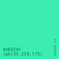 Цвет #3BEEAF в цветовой модели RGB обозначается тремя октетами (59, 238, 175) в десятичном формате и #3BEEAF в шестнадцатиричном (hex) формате, которые являются интенсивностью красного 59 (hex 3B), интенсивность зелёного 238 (hex EE) и интенсивность синего 175 (hex AF).