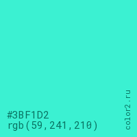 Цвет #3BF1D2 в цветовой модели RGB обозначается тремя октетами (59, 241, 210) в десятичном формате и #3BF1D2 в шестнадцатиричном (hex) формате, которые являются интенсивностью красного 59 (hex 3B), интенсивность зелёного 241 (hex F1) и интенсивность синего 210 (hex D2).
