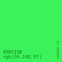 Цвет #3BF25B в цветовой модели RGB обозначается тремя октетами (59, 242, 91) в десятичном формате и #3BF25B в шестнадцатиричном (hex) формате, которые являются интенсивностью красного 59 (hex 3B), интенсивность зелёного 242 (hex F2) и интенсивность синего 91 (hex 5B).