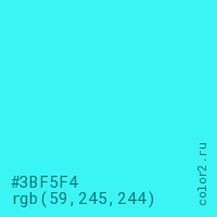 Цвет #3BF5F4 в цветовой модели RGB обозначается тремя октетами (59, 245, 244) в десятичном формате и #3BF5F4 в шестнадцатиричном (hex) формате, которые являются интенсивностью красного 59 (hex 3B), интенсивность зелёного 245 (hex F5) и интенсивность синего 244 (hex F4).