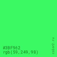 Цвет #3BF962 в цветовой модели RGB обозначается тремя октетами (59, 249, 98) в десятичном формате и #3BF962 в шестнадцатиричном (hex) формате, которые являются интенсивностью красного 59 (hex 3B), интенсивность зелёного 249 (hex F9) и интенсивность синего 98 (hex 62).