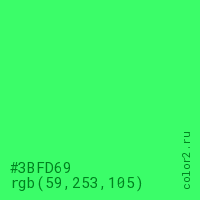Цвет #3BFD69 в цветовой модели RGB обозначается тремя октетами (59, 253, 105) в десятичном формате и #3BFD69 в шестнадцатиричном (hex) формате, которые являются интенсивностью красного 59 (hex 3B), интенсивность зелёного 253 (hex FD) и интенсивность синего 105 (hex 69).