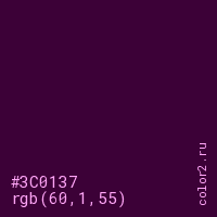 Цвет #3C0137 в цветовой модели RGB обозначается тремя октетами (60, 1, 55) в десятичном формате и #3C0137 в шестнадцатиричном (hex) формате, которые являются интенсивностью красного 60 (hex 3C), интенсивность зелёного 1 (hex 01) и интенсивность синего 55 (hex 37).