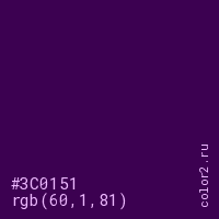 Цвет #3C0151 в цветовой модели RGB обозначается тремя октетами (60, 1, 81) в десятичном формате и #3C0151 в шестнадцатиричном (hex) формате, которые являются интенсивностью красного 60 (hex 3C), интенсивность зелёного 1 (hex 01) и интенсивность синего 81 (hex 51).