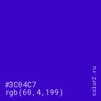 Цвет #3C04C7 в цветовой модели RGB обозначается тремя октетами (60, 4, 199) в десятичном формате и #3C04C7 в шестнадцатиричном (hex) формате, которые являются интенсивностью красного 60 (hex 3C), интенсивность зелёного 4 (hex 04) и интенсивность синего 199 (hex C7).