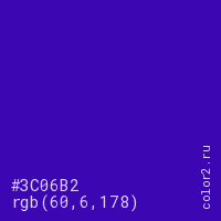 Цвет #3C06B2 в цветовой модели RGB обозначается тремя октетами (60, 6, 178) в десятичном формате и #3C06B2 в шестнадцатиричном (hex) формате, которые являются интенсивностью красного 60 (hex 3C), интенсивность зелёного 6 (hex 06) и интенсивность синего 178 (hex B2).