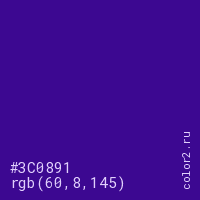 Цвет #3C0891 в цветовой модели RGB обозначается тремя октетами (60, 8, 145) в десятичном формате и #3C0891 в шестнадцатиричном (hex) формате, которые являются интенсивностью красного 60 (hex 3C), интенсивность зелёного 8 (hex 08) и интенсивность синего 145 (hex 91).