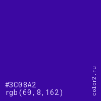 Цвет #3C08A2 в цветовой модели RGB обозначается тремя октетами (60, 8, 162) в десятичном формате и #3C08A2 в шестнадцатиричном (hex) формате, которые являются интенсивностью красного 60 (hex 3C), интенсивность зелёного 8 (hex 08) и интенсивность синего 162 (hex A2).