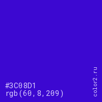 Цвет #3C08D1 в цветовой модели RGB обозначается тремя октетами (60, 8, 209) в десятичном формате и #3C08D1 в шестнадцатиричном (hex) формате, которые являются интенсивностью красного 60 (hex 3C), интенсивность зелёного 8 (hex 08) и интенсивность синего 209 (hex D1).