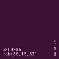 Цвет #3C0F35 в цветовой модели RGB обозначается тремя октетами (60, 15, 53) в десятичном формате и #3C0F35 в шестнадцатиричном (hex) формате, которые являются интенсивностью красного 60 (hex 3C), интенсивность зелёного 15 (hex 0F) и интенсивность синего 53 (hex 35).