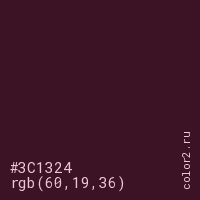 Цвет #3C1324 в цветовой модели RGB обозначается тремя октетами (60, 19, 36) в десятичном формате и #3C1324 в шестнадцатиричном (hex) формате, которые являются интенсивностью красного 60 (hex 3C), интенсивность зелёного 19 (hex 13) и интенсивность синего 36 (hex 24).