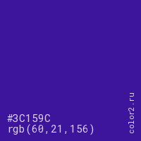 Цвет #3C159C в цветовой модели RGB обозначается тремя октетами (60, 21, 156) в десятичном формате и #3C159C в шестнадцатиричном (hex) формате, которые являются интенсивностью красного 60 (hex 3C), интенсивность зелёного 21 (hex 15) и интенсивность синего 156 (hex 9C).