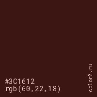 Цвет #3C1612 в цветовой модели RGB обозначается тремя октетами (60, 22, 18) в десятичном формате и #3C1612 в шестнадцатиричном (hex) формате, которые являются интенсивностью красного 60 (hex 3C), интенсивность зелёного 22 (hex 16) и интенсивность синего 18 (hex 12).