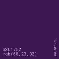 Цвет #3C1752 в цветовой модели RGB обозначается тремя октетами (60, 23, 82) в десятичном формате и #3C1752 в шестнадцатиричном (hex) формате, которые являются интенсивностью красного 60 (hex 3C), интенсивность зелёного 23 (hex 17) и интенсивность синего 82 (hex 52).